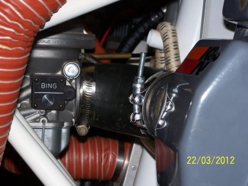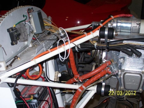 Completed FWF fuel system. Teed in a UMA 6psi fuel pressure sender between engine mechanical fuel pump and carby. Re-routed hose from gascolater to fuel pump away from exhaust scat hose. Fitted elbow between carby and air box. Made up earth strap from engine to battery