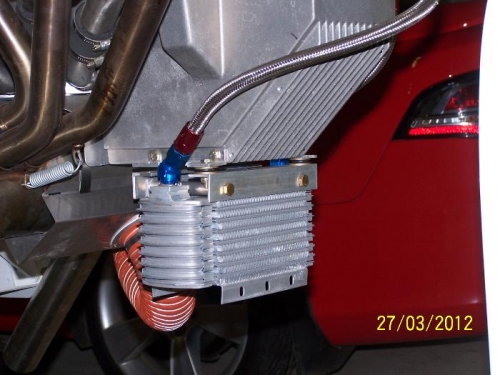 Made up brackets and oil lines for oil cooler, fitted oil cooler adapter and extension under oil filter.