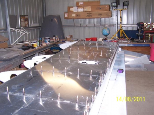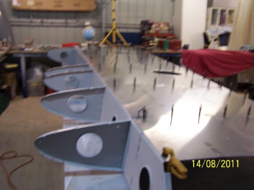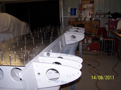 ReFitted wing skeleton and riveted together. Fitted L angles to bottom skin, cut out aileron bellcrank cover and slot for tie down ring and clecod back onto frame. Fitted nose ribs and riveted.