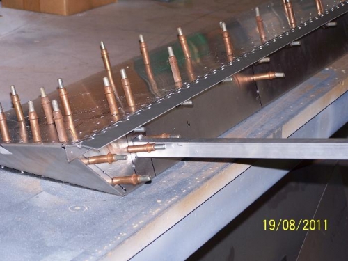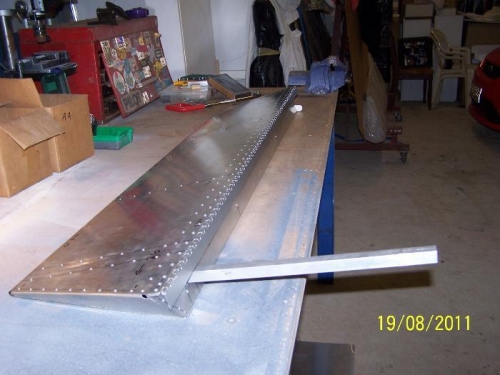 Fabricated RH aileron and riveted together. Fitted to wing and balanced. Changed over to hinges to accomadate mass balancing, as got mixed info over whether mass balancing was suitable for hingeless design. I just cut back 25mm from the leading edge of skin, added L angle to the underside of the hinge and riveted together.