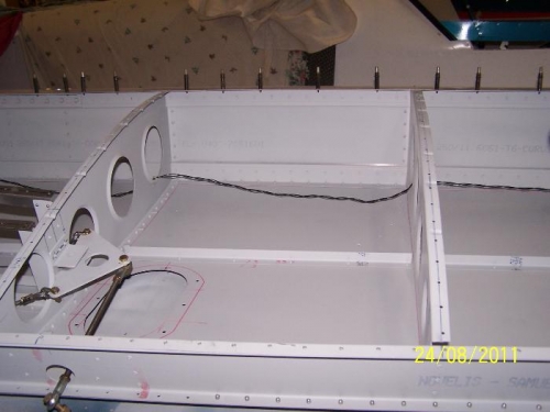 Fitted fuel tank, wiring to strobe and position light and aileron control cables. Cleaned out all wing compartments and riveted top skin and nose skin. Checked wiring to lights and fuel tank sender.