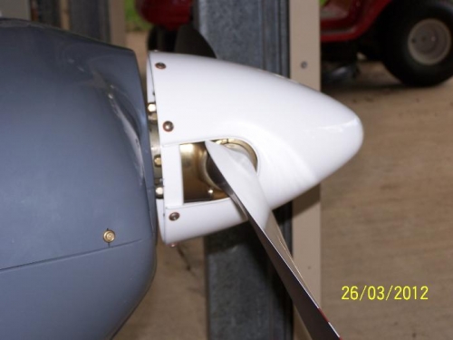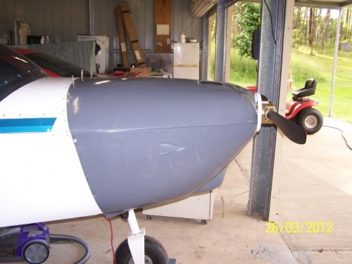 Nearly completed cowling fitment. Trimmed and sanded top cowl for a good fit. Camlocks fitted between top and bottom cowl, screws and tinnerman washers between cowl and frame. Prop and spinner mounted and looks good.