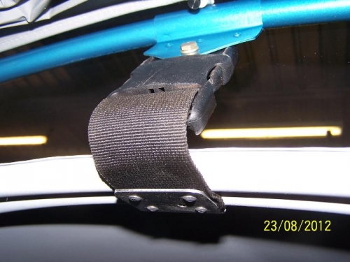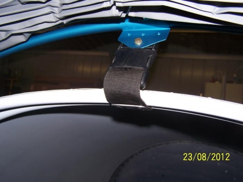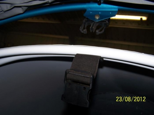 Fitted strap between rear canopy hoop and front fuse hoops. Canopy must be closed fully before the connectors will line up. Easy one hand job