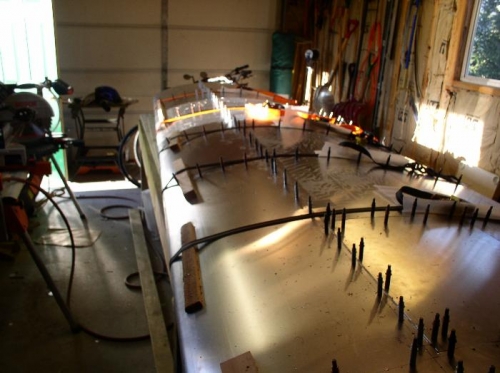 The RH wing leading edge was pulled into place and clecoed to the nose ribs, and spare flange.