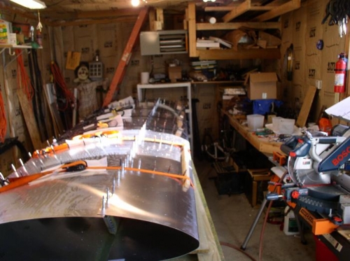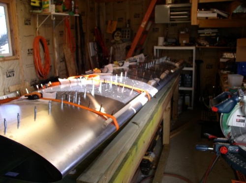 TheLH leading edge skin was cleacoed in place on the bottom of the wing, and the started to debur the bottom skin and leading edge skin on the bottom.