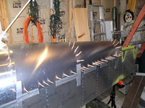 The fuselage top skins are now fit in place. The communication antenna is also located.