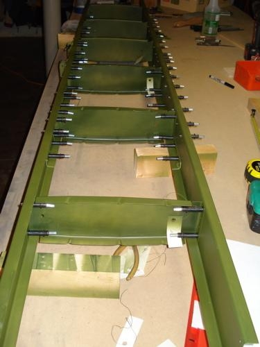 Got my Clecos and I'm off and running. Was able to get the spars and center ribs drilled and clecoed with mostly pilot holes. Don't know what I'm doing for undercoating but the green zinc oxcide looks too good. We'll see.