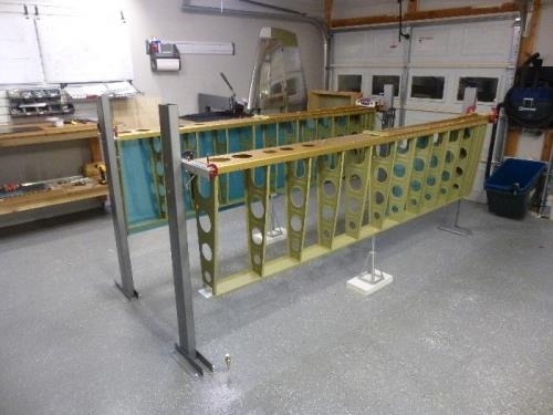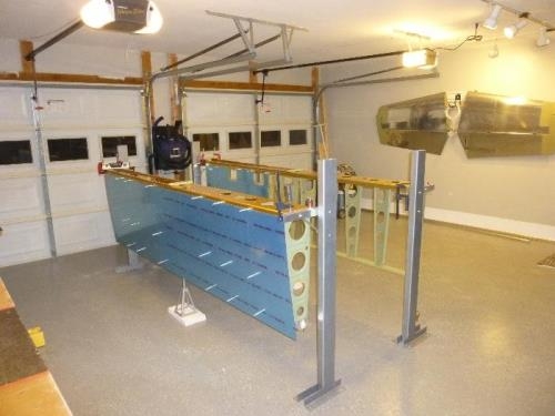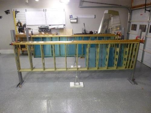 Well, with the right wing skeleton now complete, it was time to get the other half of the wing stand set up. After the issues I had getting the other side set in the concrete, I decided to try stepping up the hole size starting at 1/8 and worked my way up to 1/2. This time I kept the wing stand base in place and use it as a templet while drilling. All that is left is to final adjust the wing's position in the sling. It seemes like its been a very long road to get the wing to this point... Probably due to all of the mundane / repetive deburring, prep & priming work that goes into this first chunk of the wing. As of today, I have about 80 hours into the wing... Well worth it. I now have something that resembles a wing.