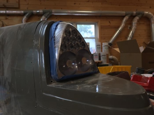 Spent time enlarging the opening in the replacement wing tip bulkhead so it would accept the Aerosun VX landing light. Cautious sanding and shaping is necessary to assure the fit is appropriate and does not restrict movement of the lamp. If you over trim, it looks messy. Also prepared the inside of the wing tip where the replacement bulkhead attaches for layups of cloth and epoxy. Used BID cloth and applied two layers of cloth. Then on the outside where the replacement bulkhead meets with the wing tip I needed to fair in the junction with epoxy and filler.