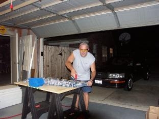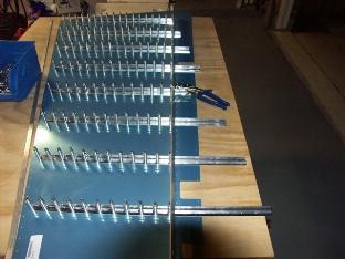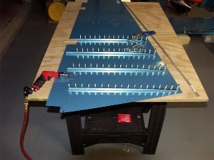 Continued work on rightside rudder. Match drilled stiffeners to skin and workboard.