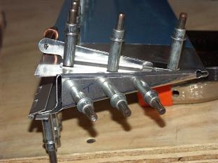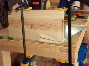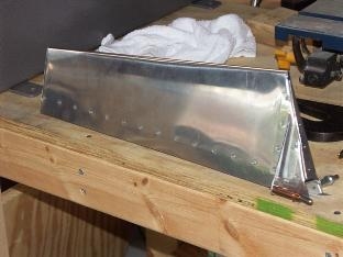 I deceided to go ahead and get the trim tab done since it required some more of the tab bending. This thing is small but it still took alot of time. As before I used the same 1x8 that I used to make the bend in the tabs on the left elevator. This skin is a bit thiner but it still took a bit of work since it is so small. I then clecoed everything together and clamped the hinge in place. It is all riveted together except for the top row along the hinge line. I talked to Gary today and he brought up a good point. What keeps all these wires from getting abrasion when all of this is together and is moving back and forth. Since the servo is in the elevator and wires have to pass thru to the horizontal stab and then into the fuselage. I guess I better get out the plans and check that out. Well I am coming up to the finish line on the elevators now. Time to mix up the proseal and do the final riveting and close up these suckers!