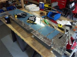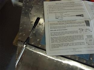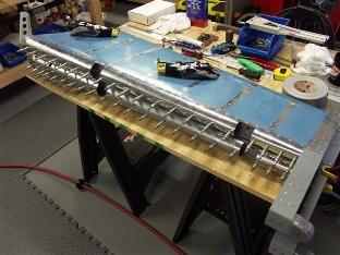 Used 3/4 inch PVC pipe to roll the leading edges of both elevators. Removed the hinge pin to allow riveting of top hinge of trim tab. Cut the electric trim rod and installed clevis's. Centered the trim servo with a 9 volt battery before installing rod.