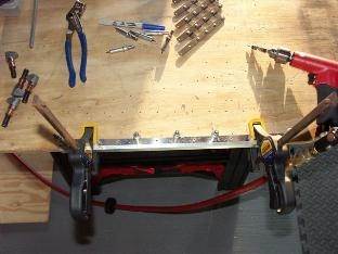 Started work on the top of the 705. Have to be careful here as there is a 1/2 inch shim that goes under an almost 2 inch plate. I decieded to clamp the shims in place and use the top bulkhead as a backdrill template. Again just carefully marked the shim placement, clamped and drilled. Next I deburred and will do the top plates the same way using the shims as a template.