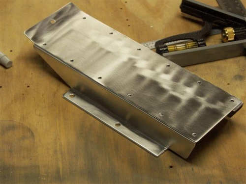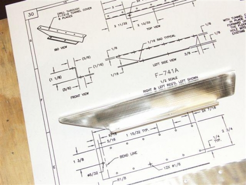 Did not get as much done yesterday as I thought I would. Continued on with the tunnel cover that I marked up for drill holes and the angled bend line. First I drilled the holes on the drill press and then started the bend in the vice. The manual says to make the bend 1/4 inch so I finished it by clamping it to the edge of the work bench and using the edge benders. They are wider than the 2 and 3/4 in cover plate so it worked great.Next I fabricated the tunnel cover side pieces. There were several mesured cuts and then you match drill the cover for the flush rivets. I will complete this tomorrow.