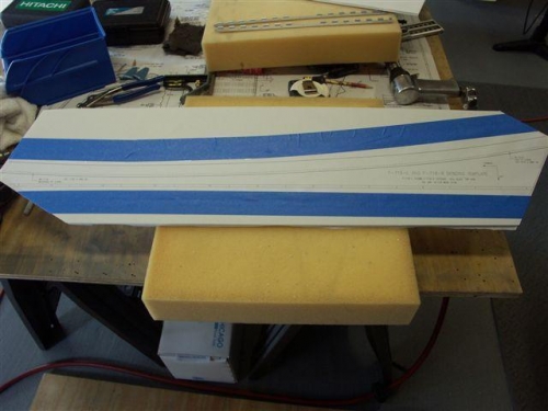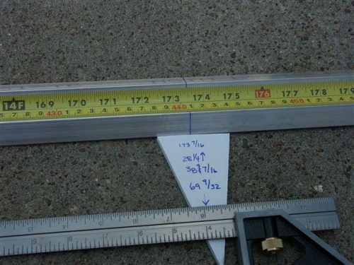 Well I have been putting this off long enough. Time to get to bending the left and right longeron angles. I cut the bending template away from the plansheet. Next I taped it to a piece of corigated board for stiffness. Measured the longerons to 173 and 7/16. Cut them to length with the cutoff saw. Then I Marked the bend start and stop points. This is kind of nerveracking because they are so long it makes you feel like you are going to screw them up. I just followed the plans and measured and marked and then did it again. Next I need to cut a notch in the back ends and then git to bending.