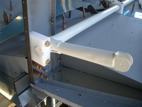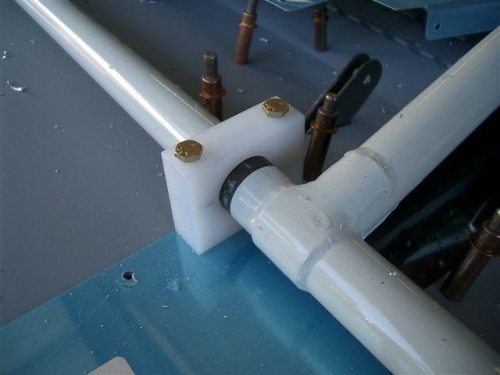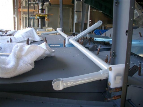 Drilled bolt holes into the center bearing block that sets to the left of the control rod. This bearing sits in the non powdercoated area of the rod. To get it to fit you then cut it in half.Dug out the bearing blocks I drilled back with making the 705 bulkhead. I tapped these onto the flap actuator weldment and bolted them in place. Next I put the top half on the center bearing block and inserted the bolts. Everything fits perfect.