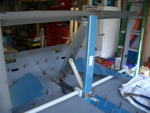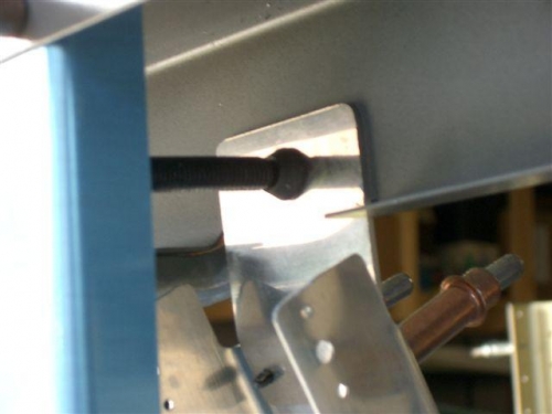 Cut out the top bracket out of .063 and made the tab bend in the vise. I did this by putting the skinny part in the vise and put a 2x4 block right at the top of the vise jaw and hit it several times with a mallet. This put all of the force right at the bending point and made the bend crisp. This metal was too thick to just pull on it. It would not of made a clean bend line.I mounted the flap motor into the front channel and connected it to the flap acuator. Next I hooked up the battery and cycled the motor thru its full range back and forth many times. This motor is sure strong because I could barely move the weldment by hand in these new bearing blocks. I would not of thought the motor would be able to move it.This makes sense though when you think about the presure that the airflow against the flaps will create when you are in flight.