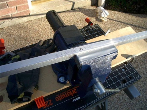 Back to the longerons. It was such a nice day I setup the Black and Decker Workmate out by the pool. Set the plastic grippers in position to hold new vise in position. I taped up the jaws with duct tape and started the bending process on the right longeron.Same as before. Hold downward pressure and wack it with the mallet. Move it half inch and do it again. Then I noticed I went to far. Spent alot of time taking some of the bend back out. This is a nerve racking process. I will just keep at it till its right and then drill the aft decks into place. These will help keep the curve in the correct position. It has to be close though. You don't want the stress of the rivets holding the bend in place.