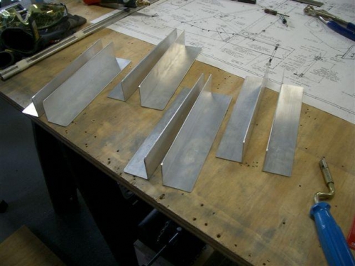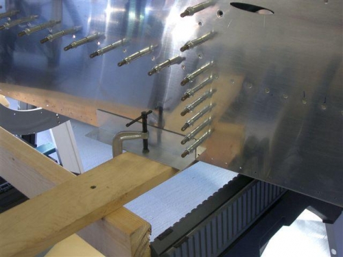 I was about to finish up the flap motor channel pieces and realized I can't final drill the side covers yet. Until the sides are on this thing the geometry can change. So I just put the flap motor in the chanel and cleaned up the pieces for priming and put them aside for now. I gotta get the aft section completed so I cut some 2 x 2 angle that I picked up from Lowes to use as stiffeners for the sides. Hopefully this will keep things stiff enough and maybe my riveting problems will go away. Clamped these into place and ready to finish the riveting.