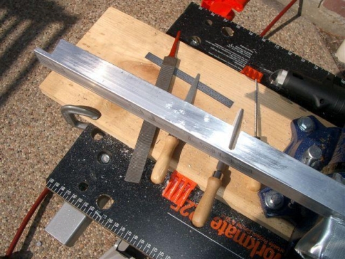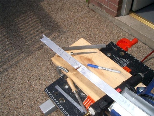 Time to notch the rear longerons and cut the notch for the HS brackets in the fuse tailcone. I used the empennage deckplate to mark the notch areas at the back of the longerons. Cut these areas out with a pnuematic hack saw. Filed em down and I think they are ready for the downward bend at the 28 1/4 mark.