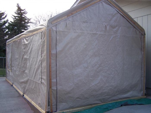 After much adoo about where to paint plane, we decided to paint it at house. City gave us a permit, we bought tent at Costco, erected, strengthened with lath, tied to concrete, used tarps for flooring. Add fans and lighting.