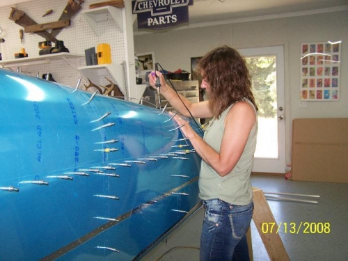Tracy burned and removed the blue plastic from rivet lines