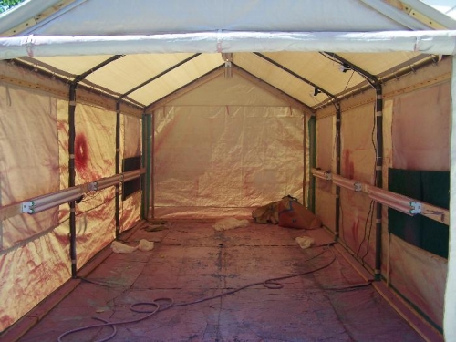 For several weekends in a row (about 5-6) painted plane part that were at the house, Then went to hanger and got the wings, brought them back to house to paint too. Start w/ tailfeathers, then fuseelage.