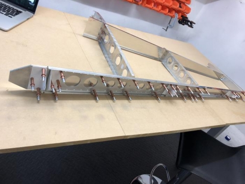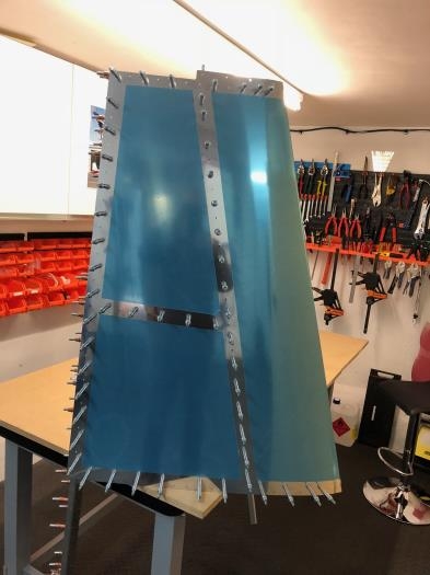 All parts of HS cleaned and ready for painting. Decided to build a jig to hold it whilst assembling and rivetting. Another trip to B and Q for MDF! Also fitted a 'sacrificial' MDF worktop to my main work bench so that I dont have to drill into the good vinyl surface.