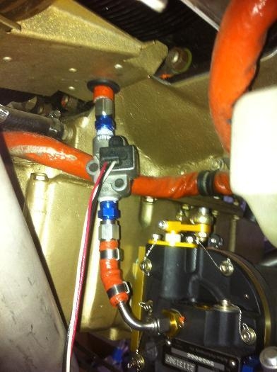 Here is the fuel line between the fuel injection controler and the spider. Airflow Performance really wanted the fuel flow transducer between the two. Here it is.