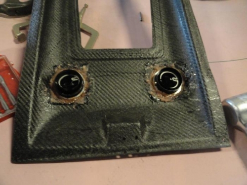 I finished installing the oxygen distributors, with washers and nuts, in preparation for plumbing and wiring. Then I tack glued the nuts for the baggage light in place before removing it. I also put the vents in place. Then I mixed resin and flox and floxed the baggage light nuts and the backing rings for the vents in place. This way those parts can be installed without having to reach behind the overhead console (impossible once it is permanently in place). The vent rings backfired a bit as the resin got into the threads. I have removed one by drilling holes in the top of the vent and passing a drill bit through to use for turning leverage. I will clean up the threads and reinstall it and, if it works well enough I will proceed with the other three.