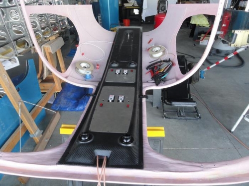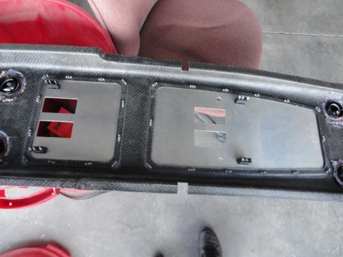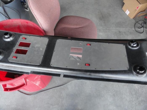 I removed the access panels and attached nutplates at every screw location, then used them as a template to drill the rivet holes. Next I removed them all and countersunk the holes. I drilled out the screw holes to 5/32" in both the overhead console and access panels. I riveted the nutplates with pop rivets and then attached the panels with 6/32 screws. While I was working on the console, I drilled the hole in the right side for the wire to control the baggage dome light, which will be glassed to the cabin top and routed down to the rear passenger seat back brace, where the relay and switch will be installed.