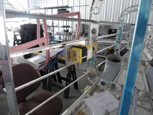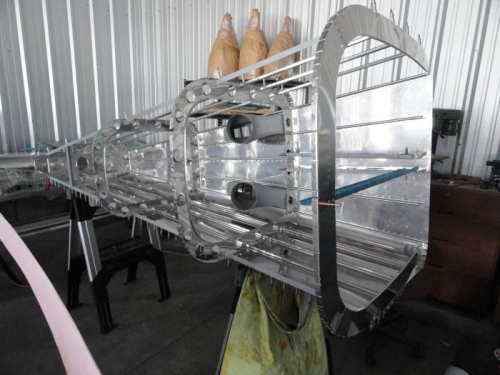 For a change of pace, since no one was available to buck rivets, I went to the tail cone and removed the right side skin. I then located the ELT mount and drilled it into place. Next, I drilled the bulkhead just aft of it for the ELT antenna and the next stringer down for the NAV antenna. I then vacuumed everything very well (it hasn't been touched in months and, in addition to the normal dust, we had a lot of pollen this spring). I deburred the skin and then clecoed it back in place. Next, I removed the left side and located the strobe power supply mount in the same fashion. In starting all this, I removed the battery mount, A/C unit, and the oxygen bottle mount. So I turned the assembly on it's right side for riveting (riveter will be underneath and bucker over the work).