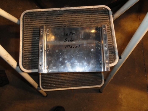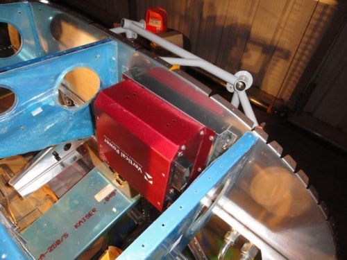 After some discussion with Aerotronics regarding interference, both physical and RF, I have decided to put the VP-200 boxes just aft of the firewall between the deck ribs. I started by making the basic mount out of alclad sheet with a Z-bend at either end which results in a standoff of about 3/4" both to keep the boxes cool and allow room for nutplates. I then match-drilled the template box Aerotronics sent me to the plates and discovered that I wouldn't need cross-stiffeners as the box does this quite well. I installed the nutplates for the box and then screwed the template to the plate and match-drilled the plate to the firewall (orientation of box has the stud for power to the left, so the logo is upside down). Then I installed more nutplates and repeated with the other mount. In the last picture you can see the right box in place on the firewall. Using the firewall stiffener below the boxes as a measuring point, the box is just above the stiffener, 11" from the side to the outboard edge of the box and the box face (with the logo) is 17" forward of the panel. The other side is the same and there is about 5" between the two boxes. In practice, I'd never be able to reach under the panel to get at the screws for the boxes, so the procedure would be to unscrew the mounts from the front of the firewall to drop the boxes and allow removal of the wiring. Installation would be the reverse and require someone inside to position the box/mount combos while another person inserts fasteners from the firewall front side.