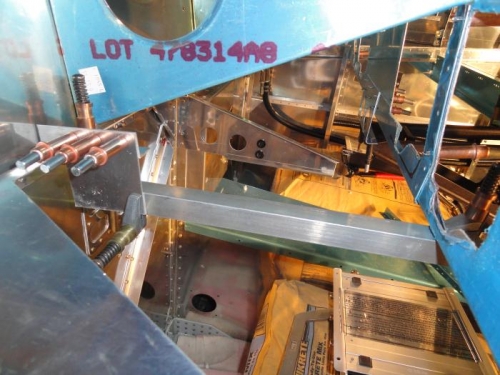 The racks themselves are .063 angle and consist of 2 side rails (angle down) to capture the boxes between them and support them fore/aft. The forward rail attachment will be to the subpanel. The cross rails are above the side rails (angle up) and are centered on the screw locations on the LSE box.They move the boxes slightly aft of the subpanel by about an inch and still leave several inches to the firewall. The coil connections will be toward the fireall and the D-subs and cooling port toward the panel. I've only done the basic cut and fit; the next task will be to drill the parts together, install the nutplates, and trim the non-mating sides of the angles to 45 degrees. The cross-rails can also be trimmed to clear the avionics racks (similar to the sub-panel) as necessary. Then the units, with LSE boxes installed, can be located laterally on the subpanel and the firewall offset attachment finalized.
