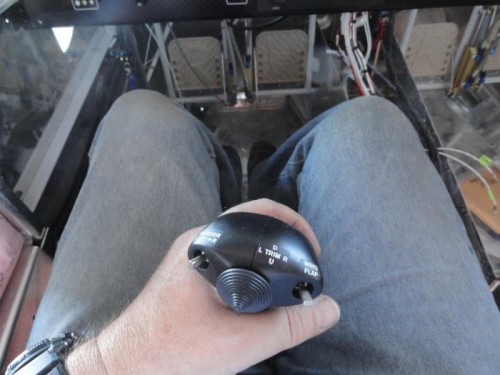 After adjusting the pitch pushrods, I tested the control sticks and determined exactly how much to shorten them. Cutting the tubes with a hacksaw was pretty easy and then I used the spacers that came with the Infinity grips as a template to drill the top and make a slot for the wiring. You can see in image 1 that the grip is canted. In this case, it is the pilot grip and is canted so that the grip is comfortable for the left hand whiile the pilot's right hand would be covering the engine controls or operating the panel. The co-pilot's side is a mirror-image. The succeeding two images show the finished grip in normal operation and in use with the off hand, which is still fairly comfortable with the hand about 1/2" lower and the palm loose over the spare button. The sticks were reinstalled and clearance verified.