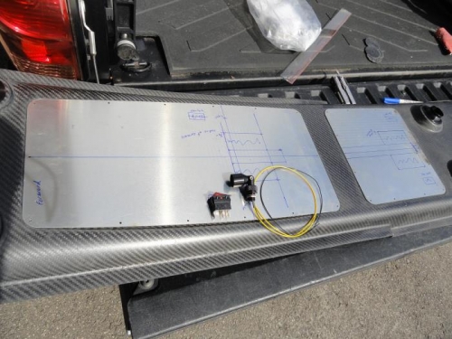 While I ponder how to locate the door pin guides accurately (I thought I had an idea but it didn't pan out), I took the time to do some work and planning on the overhead console. So the major thing going through the console is air conditioning, which meant that I needed to install the vents. A 2" carbide hole saw took care of the openings and they were quickly installed but the thickness of the console will have to be built up a bit to keep them from rattling loose. The rest that goes up there is avionics - specifically, the oxygen delivery stations and the overhead lights. I laid out the position of the delivery units in the aluminum panels, and then added the lights and switches. The plates will be machined by a friend and I am adding NC solenoids to the lighting circuits; the switch will turn off the light which will simultaneously illuminate the switch in red.The rear lights go directly into the console but the circuitry will be on the panel where I can reach. The baggage light will have its switch near the baggage door instead of in the console, so you don't have to insert yourself into the airplane to turn it on. You may notice I moved the rear lights forward of my initial mark; that makes it the same distance vent-to-light as the front and makes the lights less likely to be blanked out by a head.