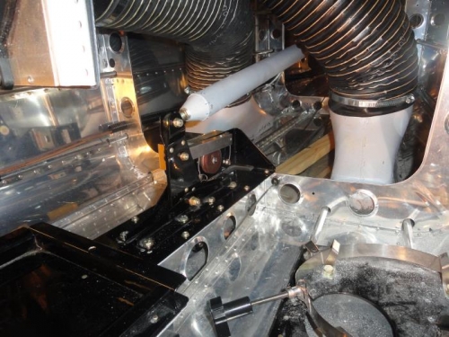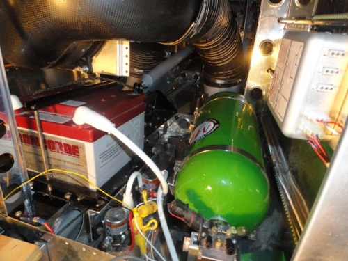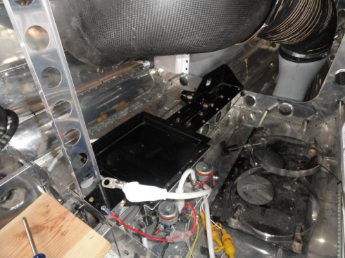 Next I put the battery back and found that the condensor interfered with a wrench for installing the battery keeper. Solution: drill and slot the rear of the keeper to fit the already installed bolt, then finish the attachemtn with the front bolt. After restoring all the wiring and testing, I installed the oxygen bottle to be sure it didn't interfere with anything. Success!