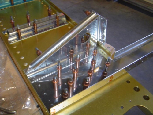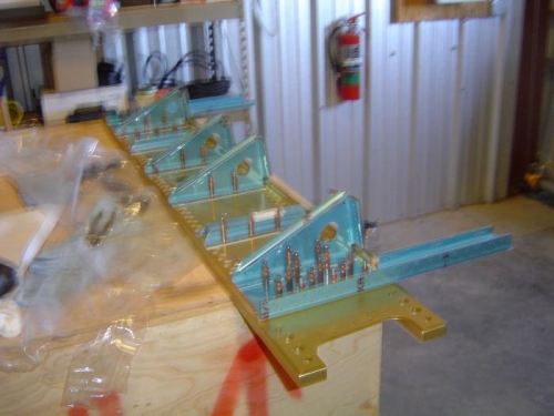 Final drilled all nutplate holes. Assembled seat rails to each other and match-drilled the common holes. Assembled seat rails and bulkhead sides to the carrythrough and match-drilled the common holes. Trimmed the end of the hat stiffeners and then cut them apart, clecoed them to the assembly, and match-drilled the common holes. Drilled all bolt holes for AN3 bolts. Assembled the F-1004-J pieces using temporary AN4 bolts and drilled the #30 holes. Countersunk the forward face of the #30 holes and all #40 nutplate holes. Began deburring of all the part in preparation for riveting.