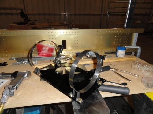 Spent most of today repairing the -6A but these parts came back from powder coat and I just had to get them together. The bellcrank was straightforward to rivet together. I riveted all the nutplates to the oxygen tank mount and the inboard mounting rail. I can't rivet the other mounting rail yet because it has to be pop-riveted to the j-stringer on the floor and that can't be done until the side skins are riveted. Then the inboard rail can also be pop-riveted to the inboard j-stringer and the outboard mounting rail will be pop-riveted to the main plate. In the meantime, I attached the tank straps with AN4-4 bolts and trial fit everything into place, using clecos to hold the mounting rails to the j-stringers. Finally, I test fit the tank in the mount.