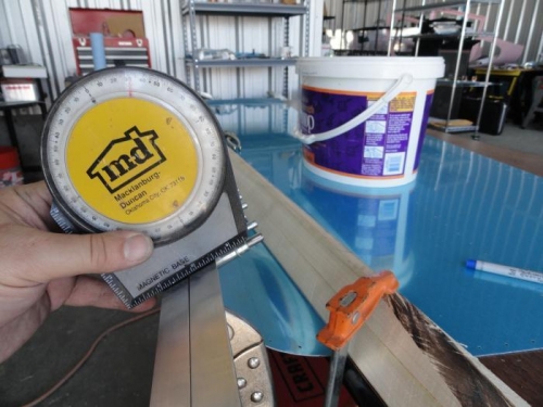 Long day today. I got a table saw yesterday and laminated a couple of 3/4" X 3 1/2" pieces of poplar. Today I cut the board per the dimensions in the instructions and also fabricated the bending angles. I used the board to clamp the right skin to the table edge and added the angles and bent the skin. It went easily but took much more bending than I expected to finally get to 60 degrees (30 on the protractor level in the first picture is subtracted from 90 at perpendicular). I fitted it to the fuselage along with the bulkhead section from the tail cone and it fit beautifully; much better than the progressive bend used on my RV-6A. You can see how smooth the bend looks in the second picture.