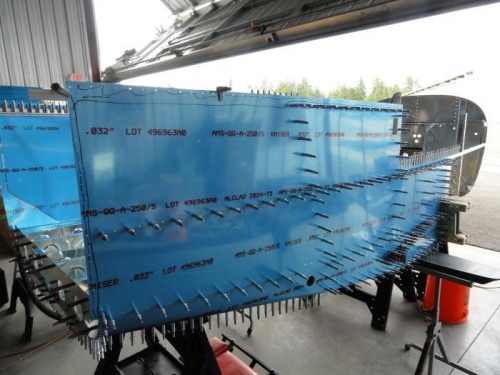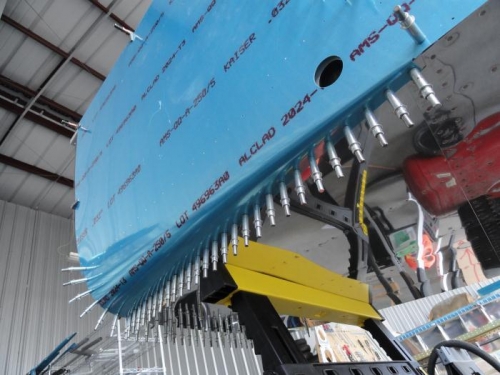 After that it was just a lot of clecoing and repeating with the left skin (and the addition of the spacers for the baggage door area and the forward side). Once the skins were in place, I match-drilled everything not marked oiut (I scribbled with the Sharpie on the blue plastic; it'll peel off and the marks will be gone), including the #30 holes and the bent edge along the bottom.