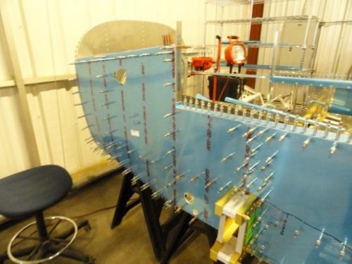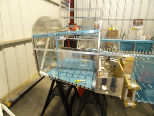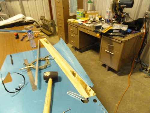 After a nice flight to Winslow for breakfast, I was too full to do much today. I bent the left forward skin (boy, was that more difficult than the mid skins). Then I twisted the forward channels and fitted the forward structure in preparation for putting the sking on. I went ahead and did that for both sides and then put the left skin on but did not match drill it yet. About then, a nice thunderstorm blew in and the rain drumming on the hangar was putting me to sleep, so I called it a day. NB: after all the pollen we had a few weeks ago, this first rain the water actually looked yellow.