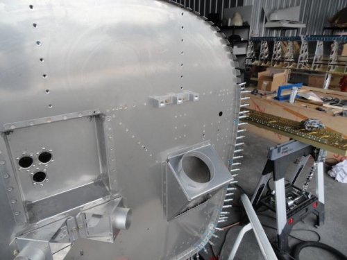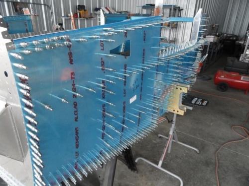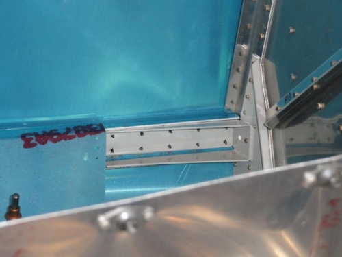 I enlisted help from Phil Cobbin to drill the lower firewall weldments to the left and right forward skin. We took a long 1x2 and he stood on the opposite side and pushed the weldment ear against the skin while I drilled. With that done, I could continue to do the other side by myseld, like yesterday. I match-drilled all the skin holes and then I match-drilled the #30 holes for the top channel on both sides. I clamped the longerons and channels to the firewall brackets in preparation for removing the skin and match-drilling the structure. I didn't have enough time to start in on removing the skins because I was going home to make sukiyaki for Judith, so I finished the day by installing the sender manifold to the firewall. That simply consisted of using two AN3 bolts and washers into the nutplates on the firewall and torquing them.