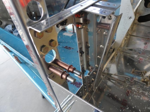 While I was installing the Marker Beacon antenna, I noticed a couple of missing nutplates in the outboard seat rail supports. When I checked, sure enough, they were missing on the other side too. I couldn't get the squeezer in there so I had to set the rivets with the gun. I removed all the conduit, marking where they came from so I could replace them once the side skins were riveted. Then I began removing the left side structure for deburring and countersinking/dimpling. I also removed the right side seat back attachment and longeron as the assembly begins there. I vaccumed and cleaned out the fuselage floor also in preparation.
