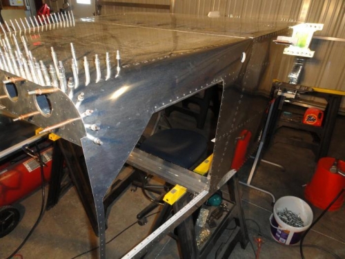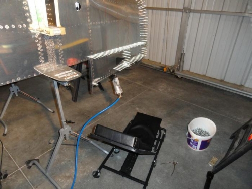 With no bucking help, I was restricted to bucking my own rivets - the ones I could reach on the left side. I coiuld easily reach around the baggage compartment opening. To reach the front area, I set up my creeper as a chair. Looks comfy, doesn't it? I finished all the left side rivets, leaving only the right side before I can turn the fuselage over.