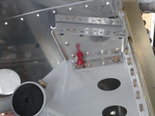 I did a few unrelated tasks. I started out the day cleaning the opening on the right RV-6A fuel tank and pro-sealing in a fitting that I had forgotten before, so I used a bit of the left over sealant to fill a hole in the firewall recess that was drilled in fitting the forward structure. ThenI riveted in the right side mid deck. With that I was able to replace the conduits for wiring in the cabin sides - though I was not able to finish the floor penetration on the left side in front of the baggage door. Next, I decided to fit the seat rails that fit over the gear towers. It took a bit of trial and error since the callouts don't seem to be in the instructions, but I found that AN3-4A bolts worked well with one or two washers. You may have noticed the red item sitting on the bolt in the third picture; it's a strong whiteboard magnet. It's used to keep the washer in place while I stick the nut in place. This has been the hardest to reach place in the RV-10, but after a lot of contortion I managed to get the nuts threaded and then torqued them in place.