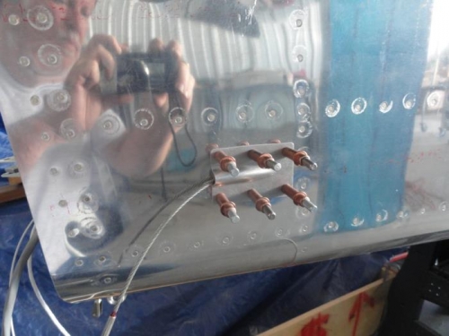 It took a long time to do a little bit. Fishing the adel clamps into place in the tail cone was difficult. Getting the washer and bolt in place was horrible, but I finally triumphed. With the guides in place, I drilled the fairings and pop-riveted them in; that was a piece of cake. I'm also still trying to get the A/C hoses assembled without any luck.