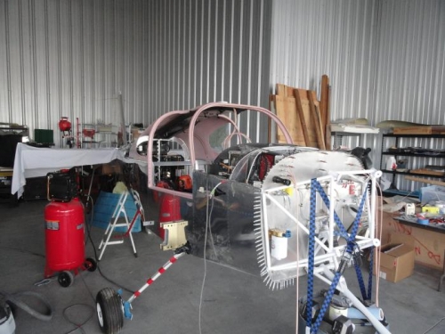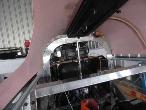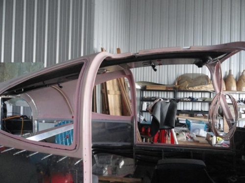 Nelson Hochberg made the mistake of dropping by to borrow a tool. I enlisted him to help me put the cabin top back on the fuselage. Once it was roughly in place, I used wood blocks under the door sections to raise it up a few inches to give me room to thread the oxygen lines and harnesses through the baggage bulkhead. Then I lowered the top into place and placed clecos in the holes along the sides aft of the doors. Those holes and the holes under the top skin need to be drilled out to #30. Then I will countersink/dimple (after raising the cabin top again) before installing the top permanently in place. With it temporarily in position, you can see how the lights and oxygen stations in the overhead work in relation to the seating.