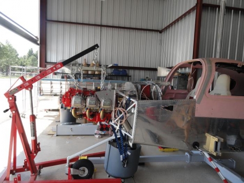 Lastly, the garbage can of concrete that has been taking the place of engine weight was unstrapped and the lift lowered and released. The engine didn't fall down. That's a good sign, right?