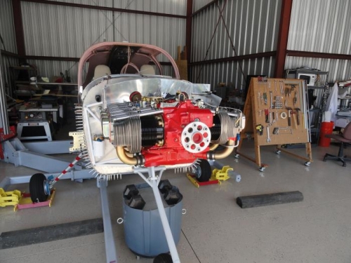 I just had to give this a try. With a possible solution for the tach drive in place, the backup alternator retorqued, and all other aft engine work done, I was ready to hang the engine. The lord mounts for the IO-540 looked much simpler than the ones for the IO-360 ... so maybe I could do this by myself? I put the engine in place as much as I could (with the airframe on the lift, I was a little sideways from the mount. I got it close enough I could put the right top bolt in. Then a little push back and I could almost get the left top in. Just a bit of a lift and then a sideways twist and in it went! Now, with the top two in and snugged, I just couldn't quite get the bottom mounts on. Changing the lift height didn't work but changing the level did the trick and I was able to start the last two and then put the inner spacer, forward rubber, and nuts on. With all nuts torqued, it turned out that one washer was plenty, though I will check it again since the engine might come off while other FWF work is done.